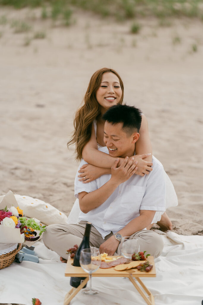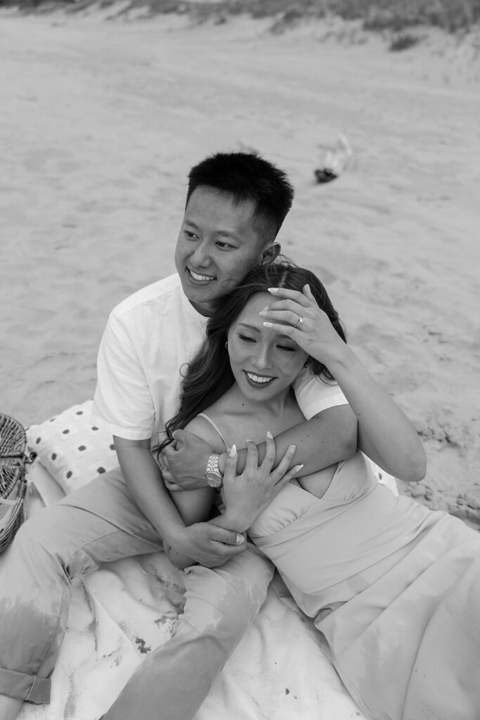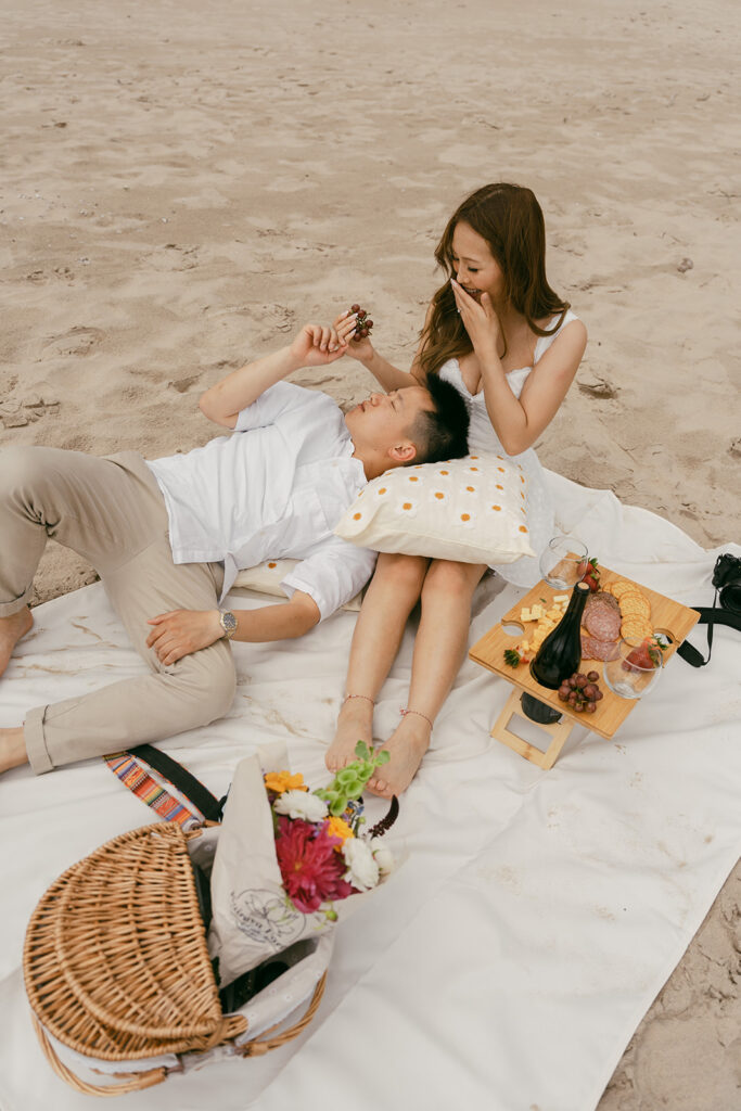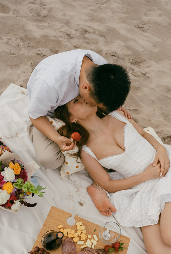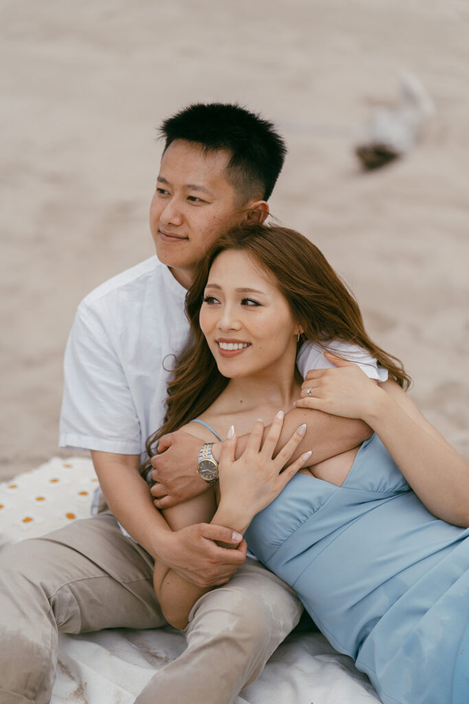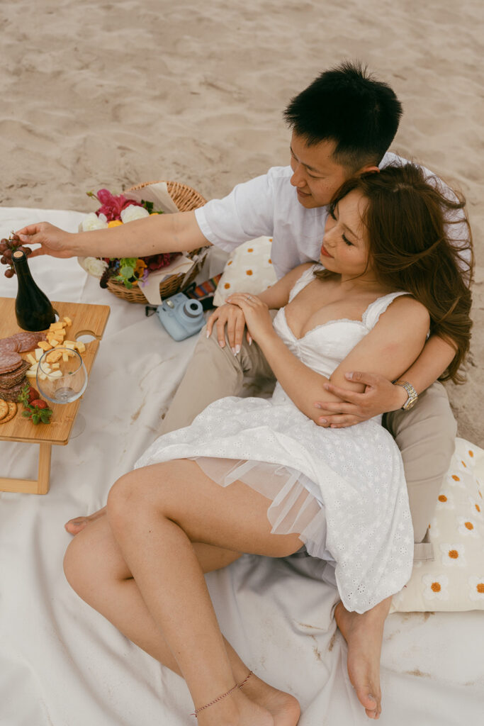 There are so many cute and fun things out there to make your engagement photos showcase you and your partners love. For this romantic photoshoot, I chose to create a beach picnic, allowing the couple to interact with one another in a way that resulted in the most romantic photos. But there are so many other fun engagement shoot ideas out there yet! A coffee shop date, intimate home session, or a trip to a local brewery can truly elevate and personalize your engagement photos.